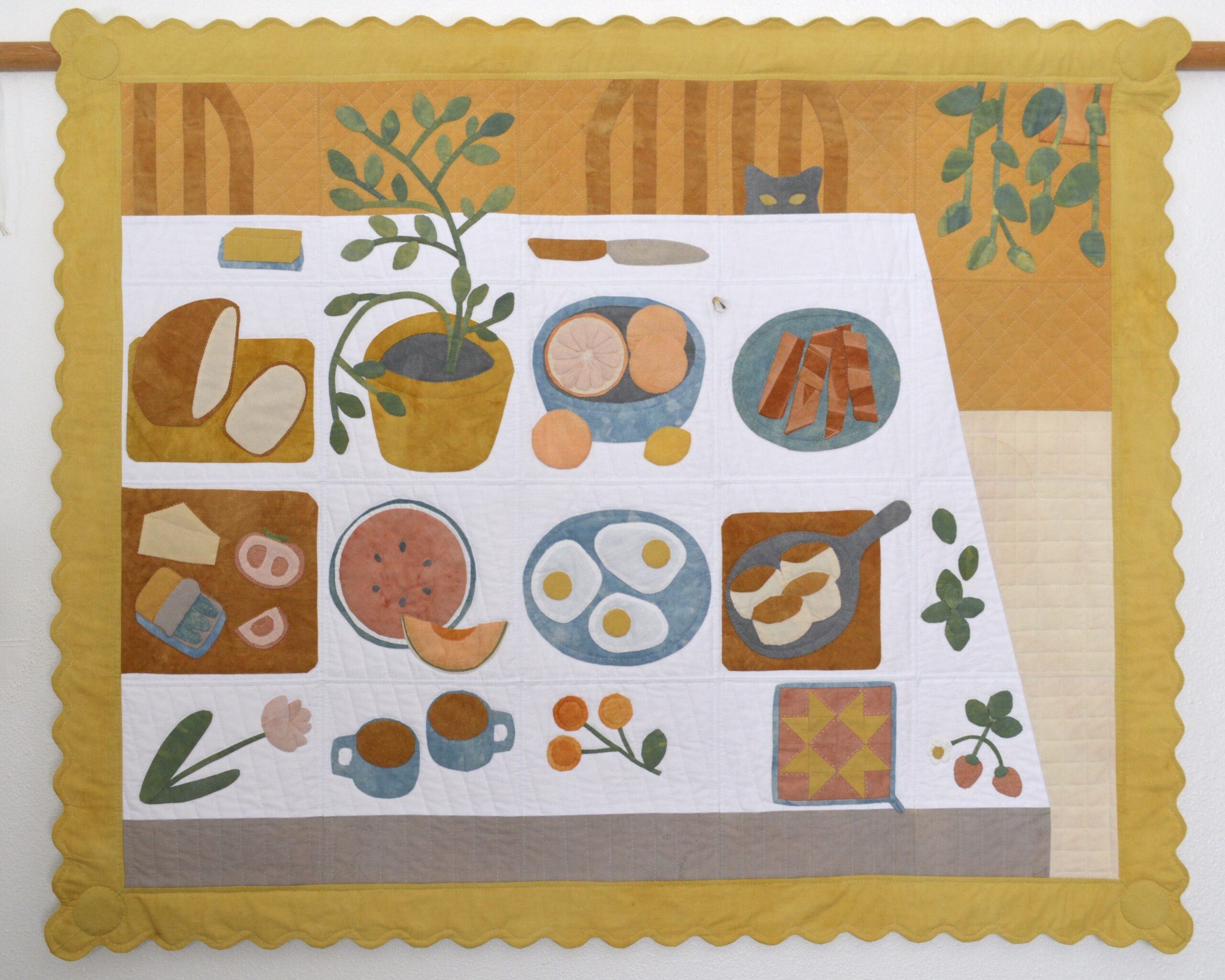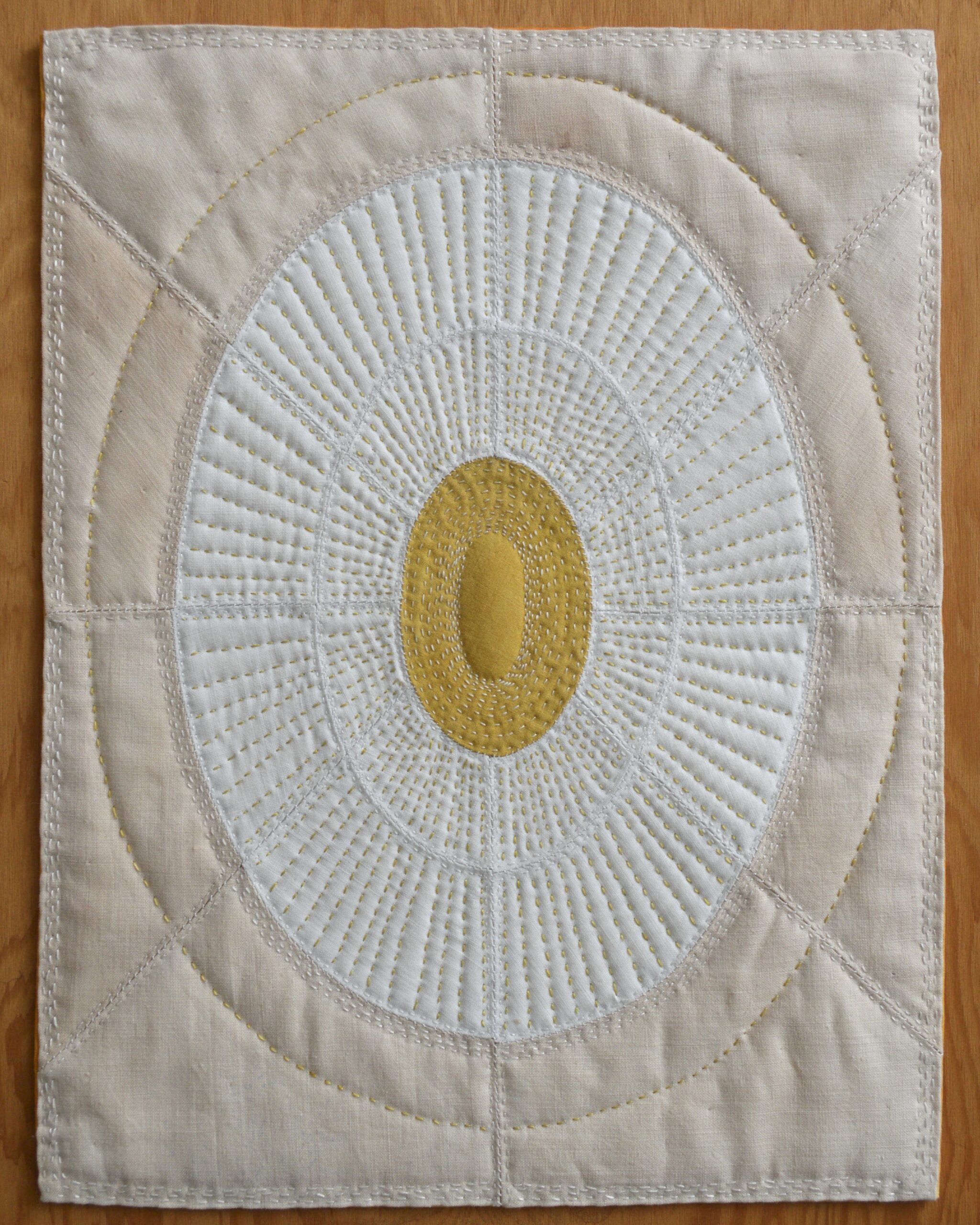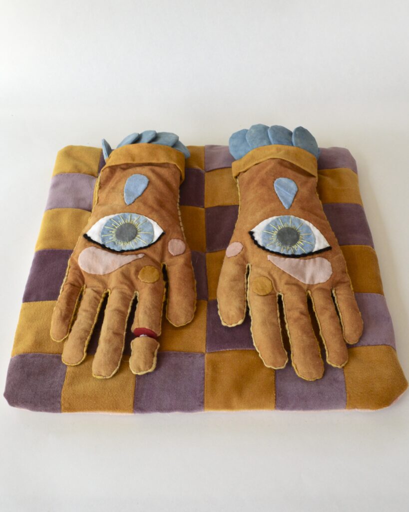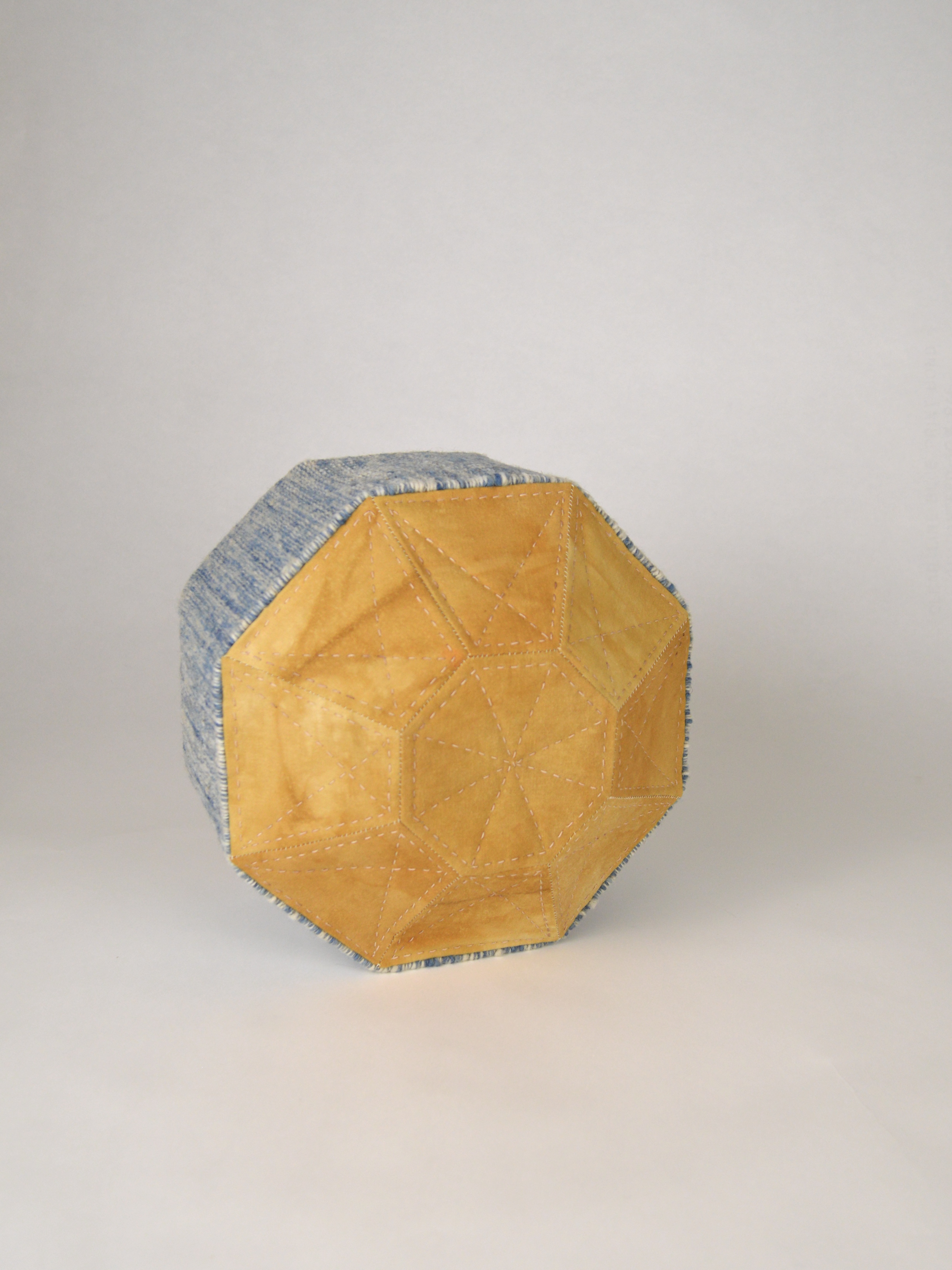 White fabric is sourced secondhand and dyed naturally to reduce dependance on commercial fabric, that is unsustainable at all stages of production and transport. The variety of fabrics (often vintage) allow her to create textures and color variations that would be difficult to achieve otherwise.